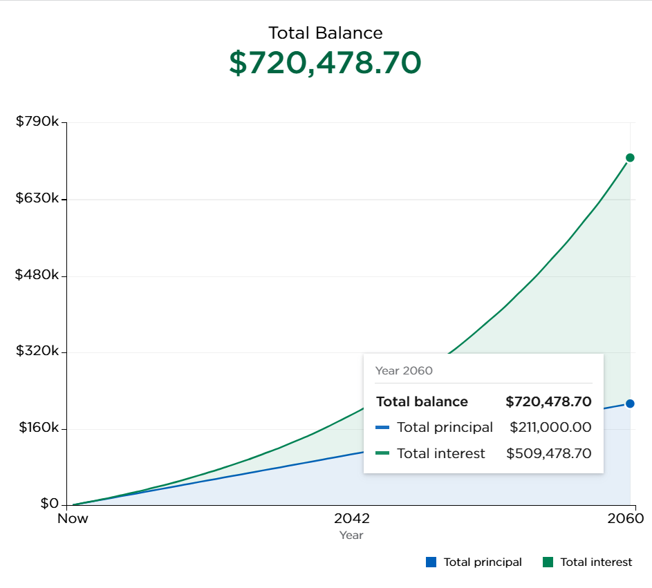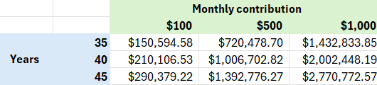 In the table below, I have calculated the total final balance of the investment account for varying monthly contributions ($100, $500 and $1000) over the course of 35, 40 or 45 years. I used this online compound interest calculator, assuming monthly compounding.