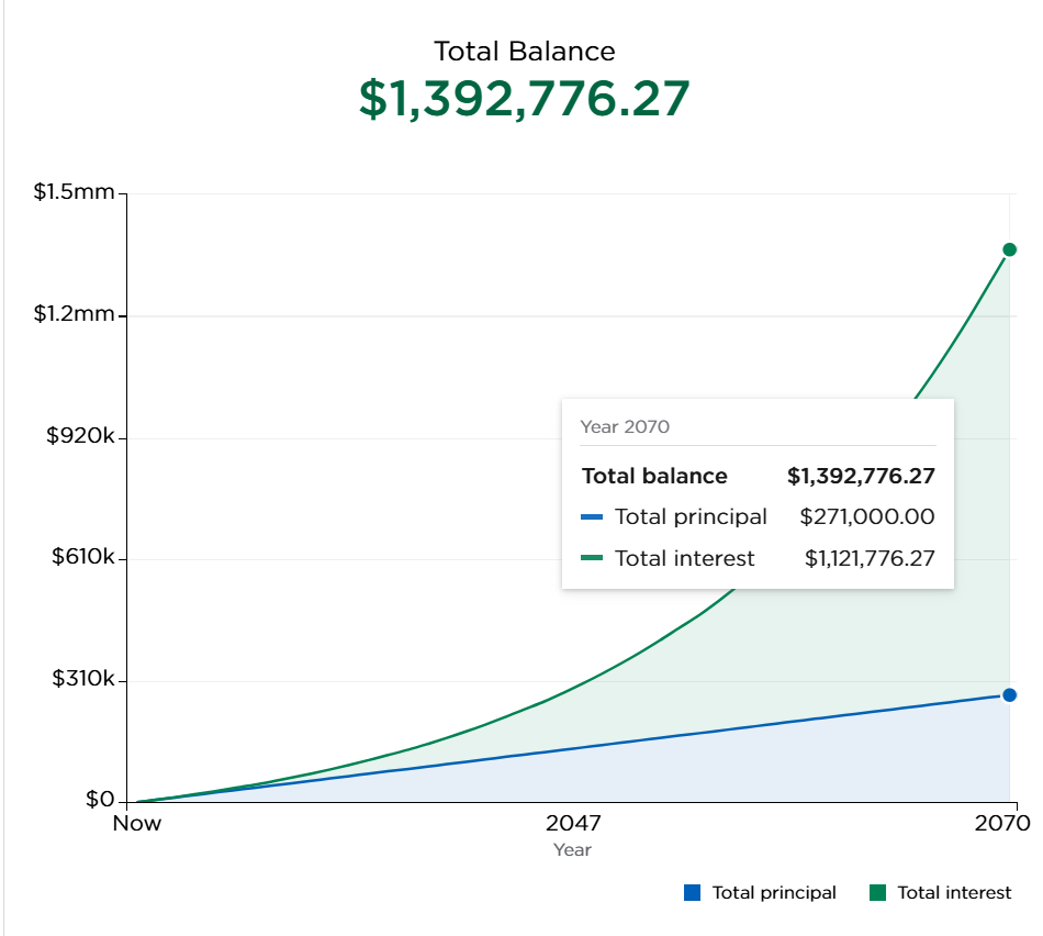 Luckily for us though, there are also plenty of examples of when exponential growth works to our advantage. One of them is the power of compound interest. When we invest or save money and earn interest on it, then each period we don’t only earn interest on the initial amount that we invested, but also the previously earned interest. What this means for us is that investing and saving as much as we can early in life will pay big dividends later.