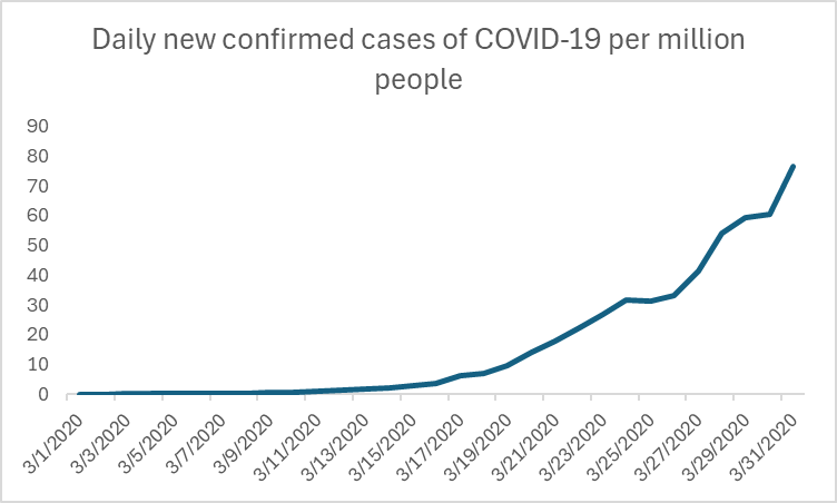 I think all of us heard and read a lot about exponential growth at the beginning of the Covid-19 pandemic. If we look back at newly confirmed Covid-19 cases in the United States during the month of March of 2020 and plot the data over time, we get the following graph.